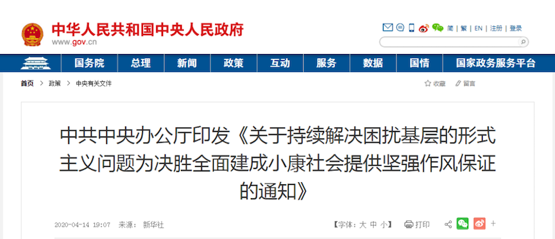 近日,中共中央办公厅印发了《关于持续解决困扰基层的形式主义问题为决胜全面建成小康社会提供坚强作风保证的...